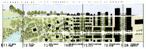 – Transit planning: the highest intensity in the city center; gradually less intensity towards the edge. This system is an analytical system that depicts elements that promote each other, creating a series of specific natural habitats and / or urban lifestyle settings. Transect integrates an environmental methodology for habitat assessment with a zoning methodology for community design. Professional boundaries disappear between natural and man-made, enabling ecologists to evaluate